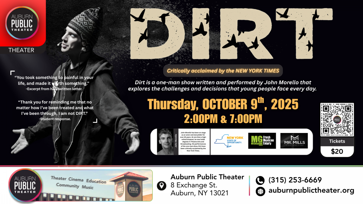 Dirt is a one-man show that explores the challenges and decisions that young people face every day. By approaching things through the lens of mental health, Dirt gets to the heart of issues related to drugs, bullying, and self esteem in a manner that resonates with audiences in a real and meaningful way. Through the portrayal of relatable and memorable characters, John Morello gives voice to those who sometimes feel as though they are not heard and reassurance to those who sometimes feel as though they are not understood. John does not preach, teach, or lecture; instead, he takes audiences on a journey that challenges them to think about the choices they make and how those choices impact their own lives and the lives of those around them.